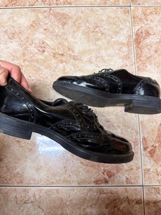 Scarpe eleganti di Zara con finitura brillante. Design Oxford con texture a quadretti. Laccetti neri. Suola nera.