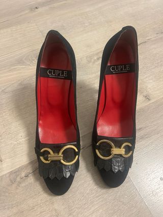 Eleganti scarpe col tacco del marchio Cuple, realizzate in pelle. Dettaglio di frange sulla punta. Adornato con metallo dorato. Interno in rosso vibrante. Prodotto in Spagna.