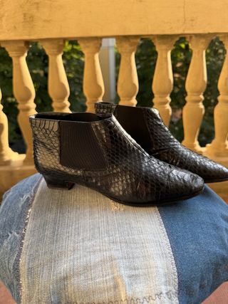 Eleganti stivaletti con un design unico. - Materiale: pelle con effetto squame di serpente. - Colore: nero. - Modello: stivaletto. Usati ma buonissime condizioni