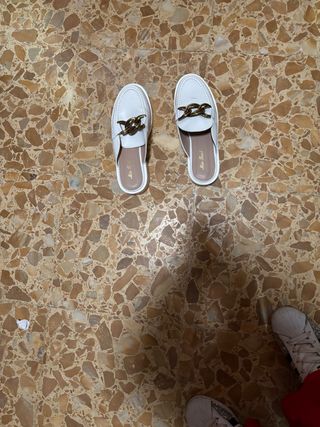 Eleganti mocassini bianchi con un dettaglio di catena dorata sul davanti. Sono comodi e perfetti per un look casual ma raffinato. - Design a punta. - Dettaglio catena color oro. - Suola piatta.
