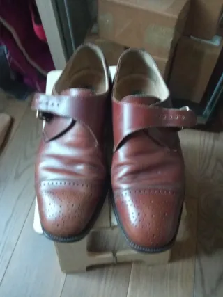 Eleganti scarpe da uomo in pelle marrone. - Design classico con cinturino e fibbia. - Dettagli traforati sulla punta (brogue). - Suola in cuoio.