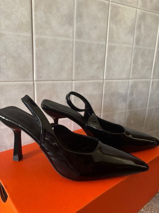 Eleganti scarpe con tacco slingback. Piccolo difetto nella seconda foto - Punta affilata. - Cinturino elastico alla caviglia - Finitura lucida.