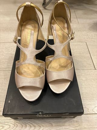 Eleganti scarpe da cerimonia Solo Soprani. - Modello con tacco. - Dettagli dorati sui cinturini. - Materiale satinato color champagne.