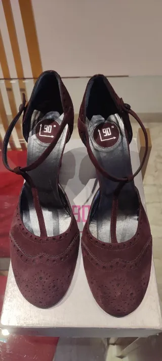 Eleganti scarpe da donna con tacco, realizzate in morbida pelle scamosciata, colore bordeaux, ottima qualità e comodità tacco nuovo altezza 9 cm, indossate pochissimo, veramente belle, scarpe di livello. - Design con cinturino a T. - Dettagli traforati. - Tacco comodo per un uso prolungato.