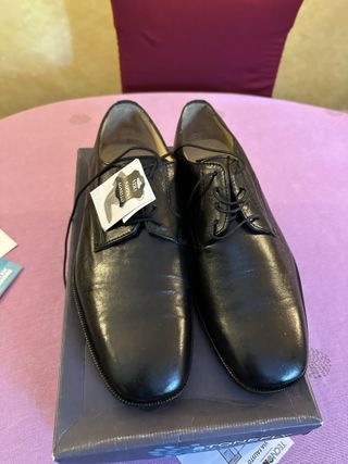 Eleganti scarpe da uomo, perfette per occasioni formali. Nuove mai utilizzate. - Design classico con punta arrotondata. - Chiusura con lacci. - Cuciture a vista sul puntale. Taglia 43.