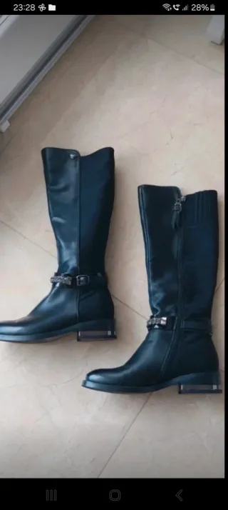 Eleganti stivali alti in pelle, perfetti per completare ogni outfit. - Dettaglio fibbia decorativa con strass. - Zip laterale per una facile calzata. - Tacco basso e comodo. - Punta arrotondata. - Piccoli segni di usura
