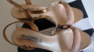 Sandalo da donna , perfetti per cerimonie ed eventi speciali. - Tacco largo e comodo. - Cinturino alla caviglia con fibbia. - Dettagli scintillanti sul cinturino anteriore. - Finitura metallica lucida.