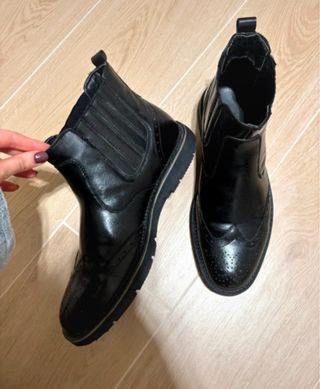 Eleganti stivaletti neri con dettagli brogue. - Tomaia in ecopelle lucida. - Elastici laterali per una calzata comoda. - Suola platform robusta. - Dettagli traforati tipici del brogue.