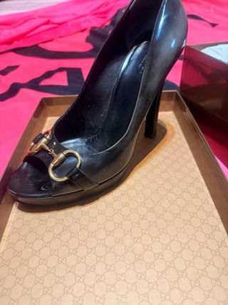 Eleganti décolleté Gucci in pelle nera. - Modello peep-toe con tacco alto. - Logo Gucci inciso sulla soletta interna. - Include dustbag originale.