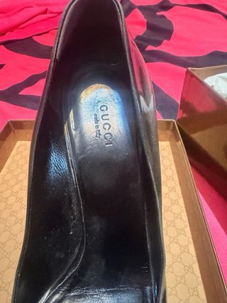 Eleganti décolleté Gucci in vernice, taglia 37. Vengono fornite nella loro scatola originale. - Modello con tacco alto. - Finitura lucida. - Logo Gucci impresso sulla soletta.