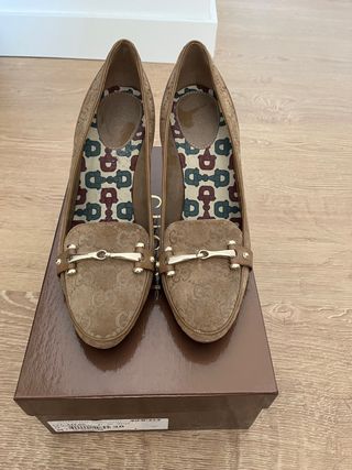 Zaino con l'iconico motivo GG di Gucci. Design classico nei toni del beige e del marrone. Finitura lucida. Le scarpe GUCCI sono più usurate dello zaino ma non molto perché sono un regalo e mi sono un po' piccole, numero 41 - prezzo 200 €. Lo zaino è quasi nuovo, sembra nuovo - prezzo 1000 €.
