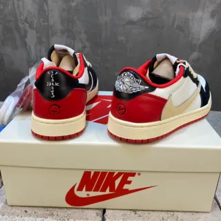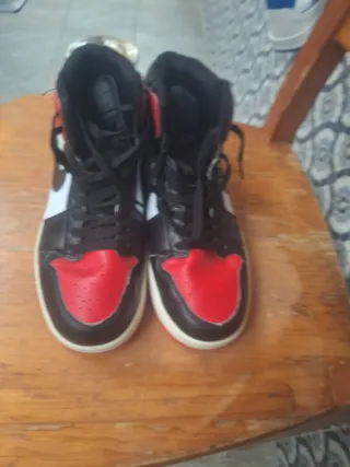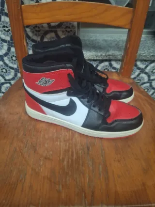 Scarpe Jordan 1 in perfette condizioni, nuove e nella loro scatola originale. Design iconico con dettagli in bianco, nero, rosso e beige. Suola di gomma rossa con motivo antiscivolo. Lacciuoli color crema.