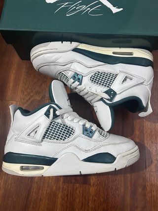 Scarpe Jordan 4 in colorazione Oxidized Green. - Tomaia in pelle bianca. - Dettagli in verde foresta. - Suola con unità Air visibile.