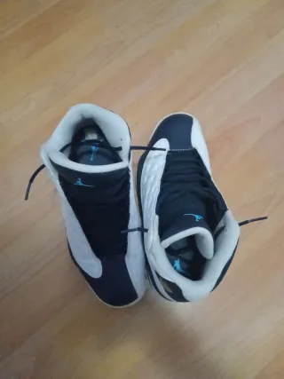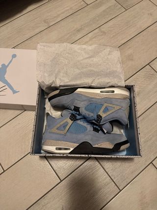 Scarpe Jordan 4 in tonalità blu e grigio. sembrano sporche ma è la luce , indossate 5 volte e messe in esposizione tanto che ci sono delle piccole spellature dovute all’originalità - Tomaia in pelle scamosciata blu. - Dettagli in grigio screziato. - Suola in gomma nera e bianca