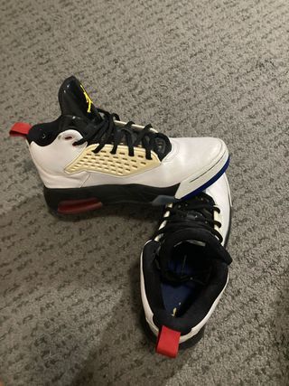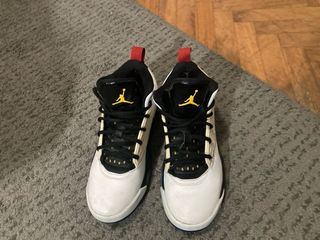 Sneakers sportive Jordan Air in ottime condizioni. Design con tomaia alta. Combinazione di bianco e nero con dettagli in giallo e rosso. Chiusura con lacci.