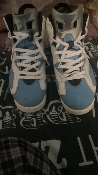 Scarpe sportive Jordan 6. Design classico in bianco e blu. Dettagli traforati sul lato.