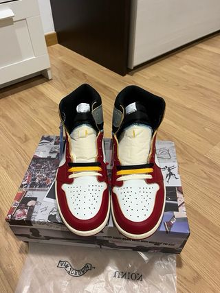 Sneakers Jordan 1 x Union. Combinazione di colori rosso e bianco. Design con tomaia alta.