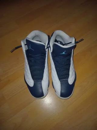 Scarpe da ginnastica Jordan 13 Retro in toni blu navy e bianco. Design a taglio alto. Chiusura con lacci. Logo Jordan sulla linguetta.