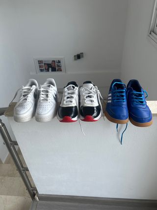 Lotto di scarpe sportive seminuove delle marche Adidas, Jordan e Nike. - Scarpe bianche stile Nike Air Force 1. - Scarpe nere, bianche e rosse stile Jordan 11. - Scarpe blu stile Adidas. Chiedere prezzo e taglia. Lotto 70€. Adidas 37 1/2. Jordan 36. Air Jordan 36.