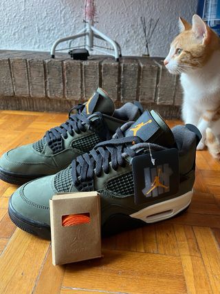 Sneakers Jordan 4 con un design ispirato al modello Undefeated. Colore verde militare e nero. Dettaglio di pannelli texturizzati. Suola in gomma a contrasto. Completamente nuovo e autentico, acquistato da Nike.
