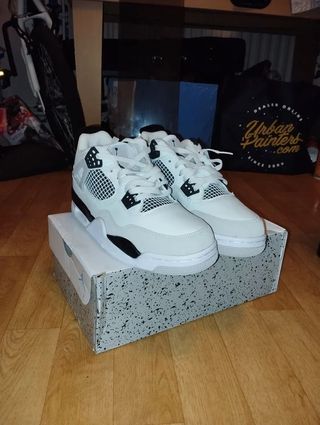 Scarpe da ginnastica Jordan 4 in bianco e nero, taglia 41. Design iconico. Combinazione di colori classica.