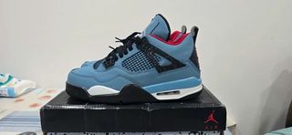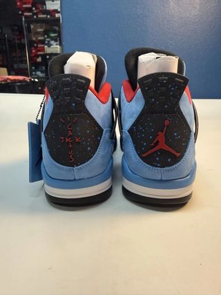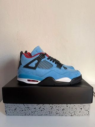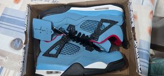 Scarpe Jordan 4 in taglia 42 per uomo. Presentano un design accattivante nei toni del blu e del rosso. - Include scatola originale. - Dettaglio etichetta. - Design ispirato a Travis Scott.