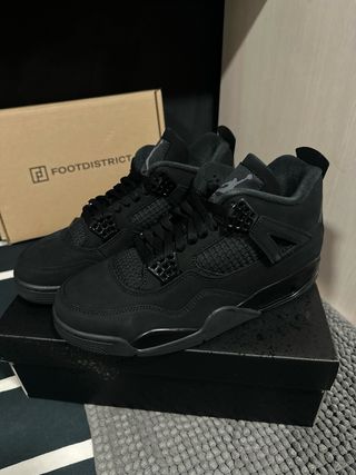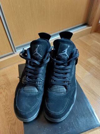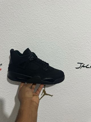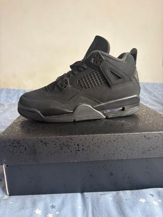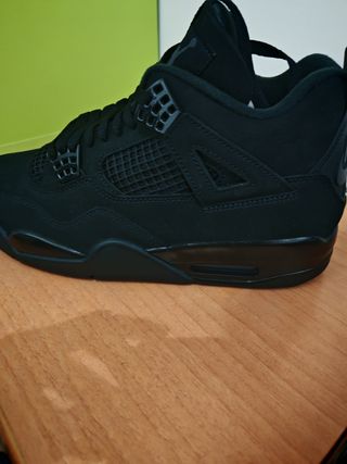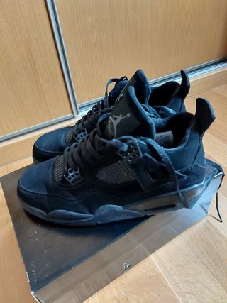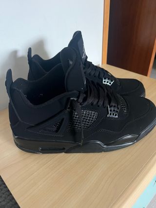 Sneakers Air Jordan 4 stile Black Cat, completamente nere. Taglia 44. Misura della soletta interna circa 27 cm. Hanno solo 1 anno e sono in buone condizioni. Le vendo perché mio figlio non le indossa. Consegnabile a Sanchinarro, Bernabéu o Avda América.