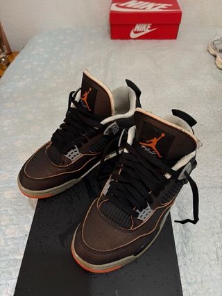 Scarpe Air Jordan Retro 4 in colore Taupe Haze. Un design iconico con dettagli in marrone e beige. - Tomaia in pelle scamosciata. - Rivestimenti sintetici. - Dettaglio in mesh sui lati. - Suola in gomma. - Quasi nuove. - Spedizione rapida. Regalate a mio figlio, sono un po' strette.