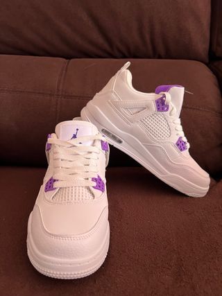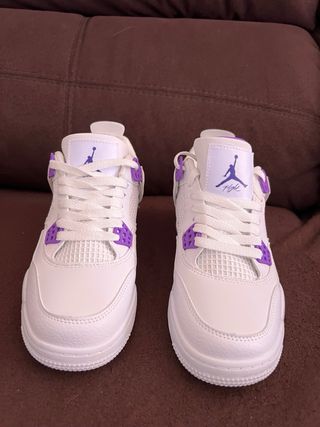Sneakers Jordan 4 con dettagli in viola e bianco. Design iconico, lacci bianchi, dettaglio del logo Jumpman sulla linguetta.