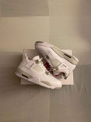 Scarpe da ginnastica Jordan 4 da uomo, taglia 43. Un design moderno e comodo. - Esterno in pelle bianca con dettagli grigi. - Suola in gomma per una maggiore trazione. - Chiusura con lacci per una vestibilità sicura.