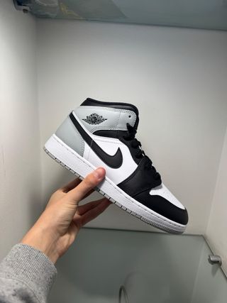 Scarpe Air Jordan 1 Mid in colorazione Smoke Grey. - Modello Mid. - Taglia 39. - Design con pannelli grigi e bianchi.
