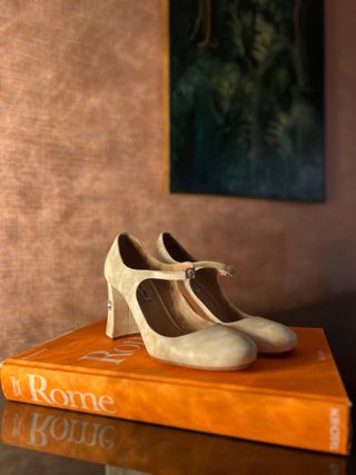 Eleganti scarpe col tacco con finitura brillante. Design Mary Jane. Tacco grosso e squadrato. Cinturino regolabile alla caviglia.