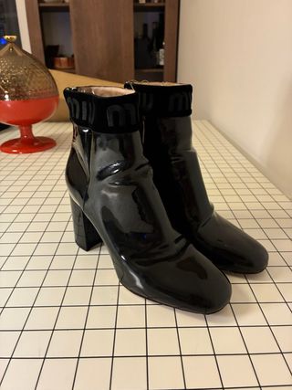 Bellissimi tronchetti Miu Miu in vernice nera, usati pochissimo. - Dettaglio logo Miu Miu sul bordo superiore. - Tacco squadrato. - Finitura lucida.