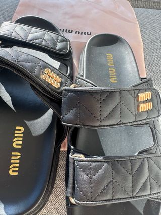 Chanclas Miu Miu da donna, nuove. Design imbottito. Tiras ajustables con velcro. Logo metallico dorato.