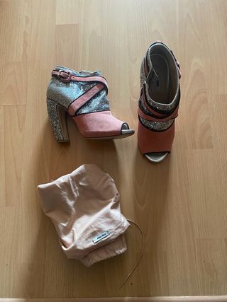Eleganti stivaletti Miu Miu con un design accattivante. Combinazione di camoscio rosa e dettagli argentati brillanti. Tacco grosso e alto. Punta aperta. Chiusura con fibbia. Sono praticamente nuovi. Manca il tirazip su uno degli stivaletti ma la cerniera funziona correttamente.