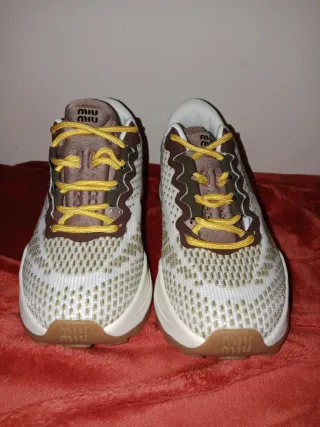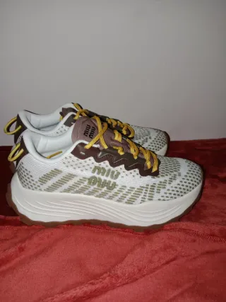 Sneakers del marchio Miu Miu con un design moderno. Combinazione di colori marrone e bianco. Dettaglio del logo sulla linguetta. Lacci gialli. Suola in gomma.