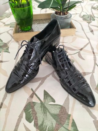 Eleganti stivali Miu Miu in charol con dettagli brillanti sul tacco. Modello derby molto di tendenza. Quasi inutilizzati, indosso una taglia in più. Colore giallo e argento. Chiusura con lacci. Design tipo Oxford.