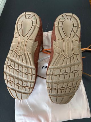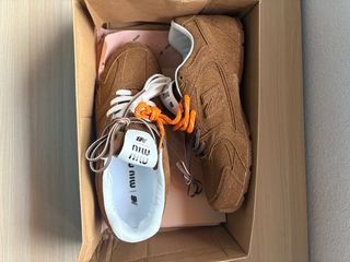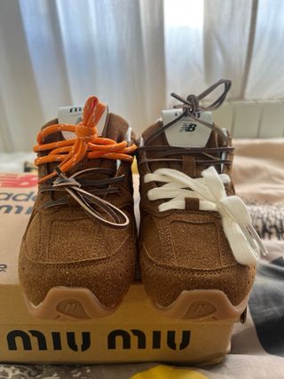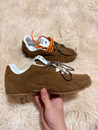 Sneakers New Balance color cammello, nuove. - Design esclusivo Miu Miu. - Lacciuoli di ricambio inclusi. - Taglia piccola. - Acquistate in Turchia.