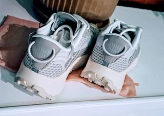 Miu Miu, scarpe da ginnastica in rete tecnica, grigio chiaro. Parte superiore in rete, lacci a contrasto, soletta imbottita, tiraggio nella parte posteriore. Acquistate a Dubai per 750€.