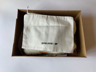 Set composto da busta e scatola per scarpe Miu Miu. la scatola misura 31 × 17,5 × 11,5 e la busta 35 × 25 × 14 i due prodotti sono vendibili anche singolarmente.