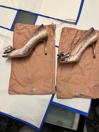 Tacchi eleganti Miu Miu con design in pelle con stampa serpente. Finitura in pelle con motivo serpente. Dettaglio con fiocco sulla punta. Tacco a spillo. Con la scatola originale e sacchetti per la conservazione. 500€ negoziabile