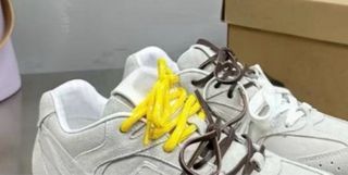 Sneakers dal design esclusivo che combinano l'estetica di New Balance con il tocco di Miu Miu. Il colore grigio neutro è completato da dettagli vivaci. - Lacciuoli gialli. - Dettaglio logo sulla linguetta.