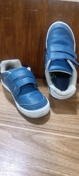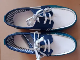 Scarpe in stile nautico con chiusura in velcro per bambini, taglia 33, praticamente nuove con solo un paio di uscite, visionabili senza impegno. - Design con dettagli marinareschi. - Suola bianca. - Interno blu.