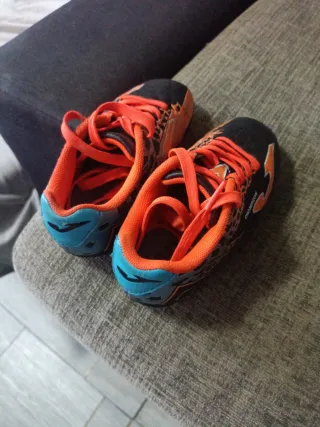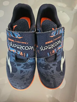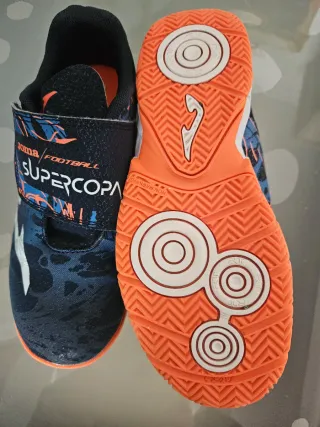 Scarpe da calcio a 5 Joma Supercopa per bambini. - Chiusura con velcro. - Design sportivo con dettagli in arancione e blu. - Suola in gomma. - Logo Joma sulla linguetta e sul lato.