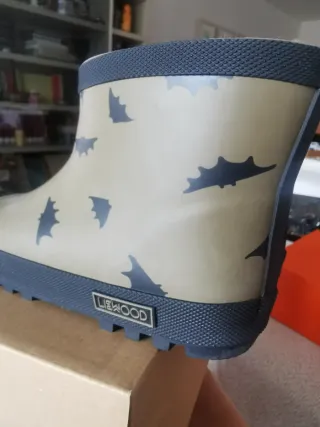 Stivali da acqua per bambini con un divertente motivo a pipistrello. Perfetti per i giorni di pioggia. Mai indossati. Della rinomata marca Liewood. Design con pipistrelli. Fodera interna morbida. Cinghietta posteriore per facilitare l'indossaggio.