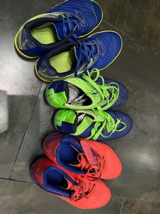 Set di tre paia di scarpe da calcio per bambini taglia 33. Design vari per diversi gusti. - Un paio in blu con dettagli in giallo. Tacos - Un paio in blu con lacci e dettagli in verde lime. Tacos - Un paio in rosso con lacci e chiusura in velcro.