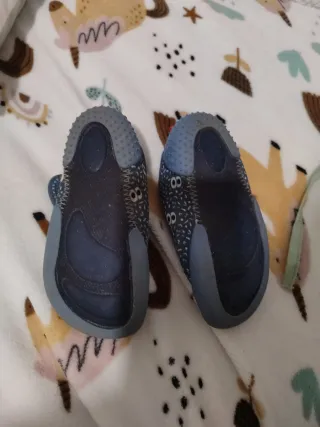 Ciabatte da piscina per bambini con un divertente motivo. - Taglia 18/20 - Chiusura con velcro. - Cinturino posteriore rosso. - Suola flessibile.