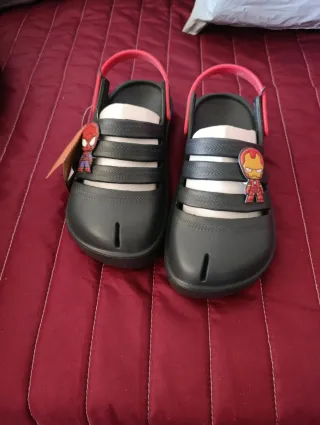 Sandali per bambini del marchio Havaianas con tema Marvel. Design in nero con dettagli rossi. Personaggi Marvel. Cinturino posteriore regolabile.