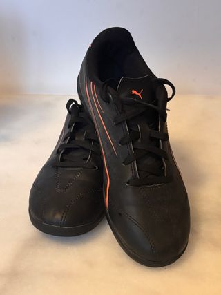 Scarpe da calcio Puma in nero con dettagli arancioni. Design sportivo. Chiusura con lacci.