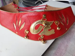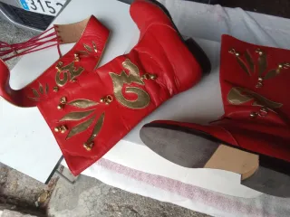 Stivali zingari di Elda Moros per bambini. Sono di colore rosso e presentano dettagli dorati. Adornati con motivi floreali dorati. Piccoli sonagli dorati. Chiusura con lacci rossi.